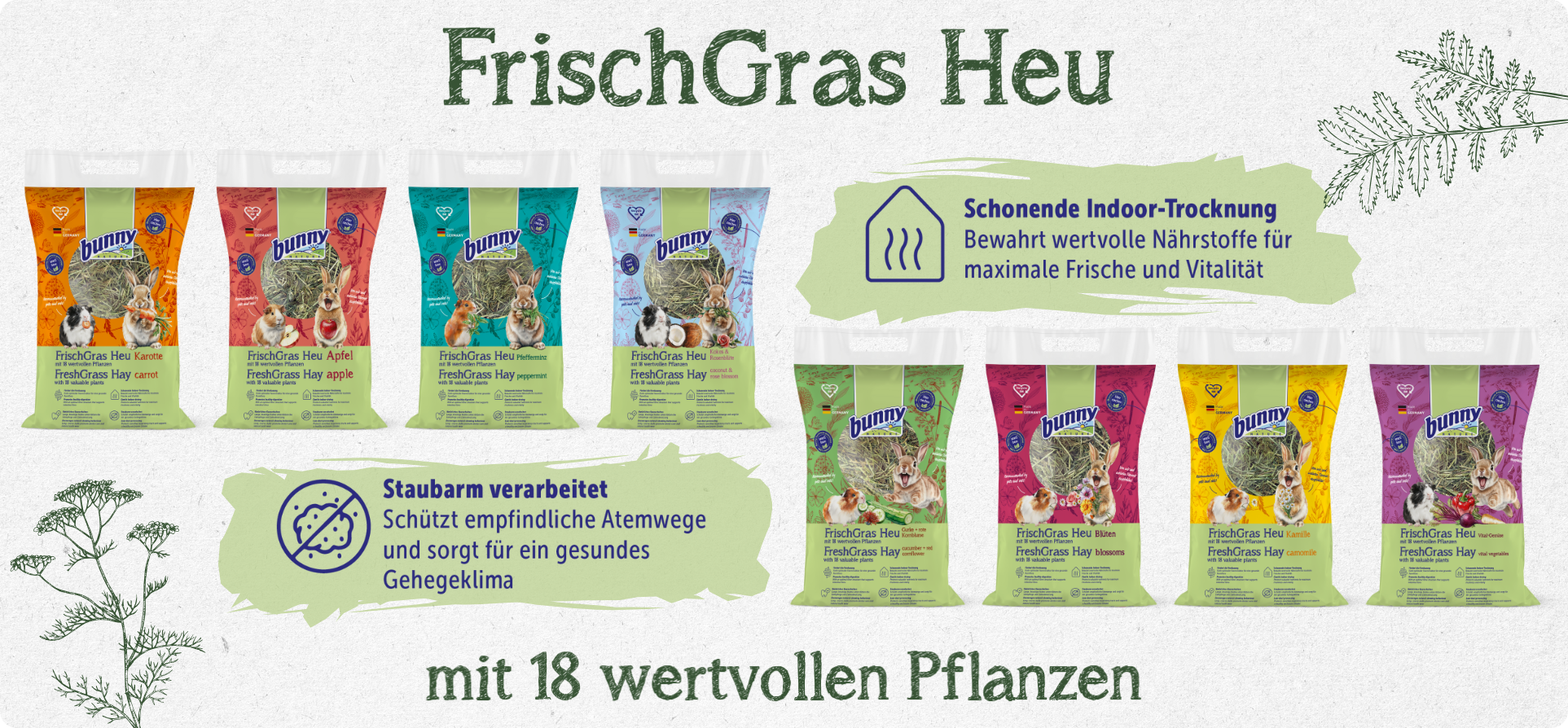 Dieses Frischgras Heu wird durch Gurken und roten Kornblumenblüten abgerundet. Die milde, harmonische Kombination sorgt für Abwechslung und macht das Heu besonders attraktiv für die Tiere. Gleichzeitig bleiben alle Eigenschaften des Frischgras Heus erhalten: lange Halme, optimale Faserstruktur, schonende Trocknung und staubarme Verarbeitung.Mischfuttermittel für Zwergkaninchen & Nagetiere